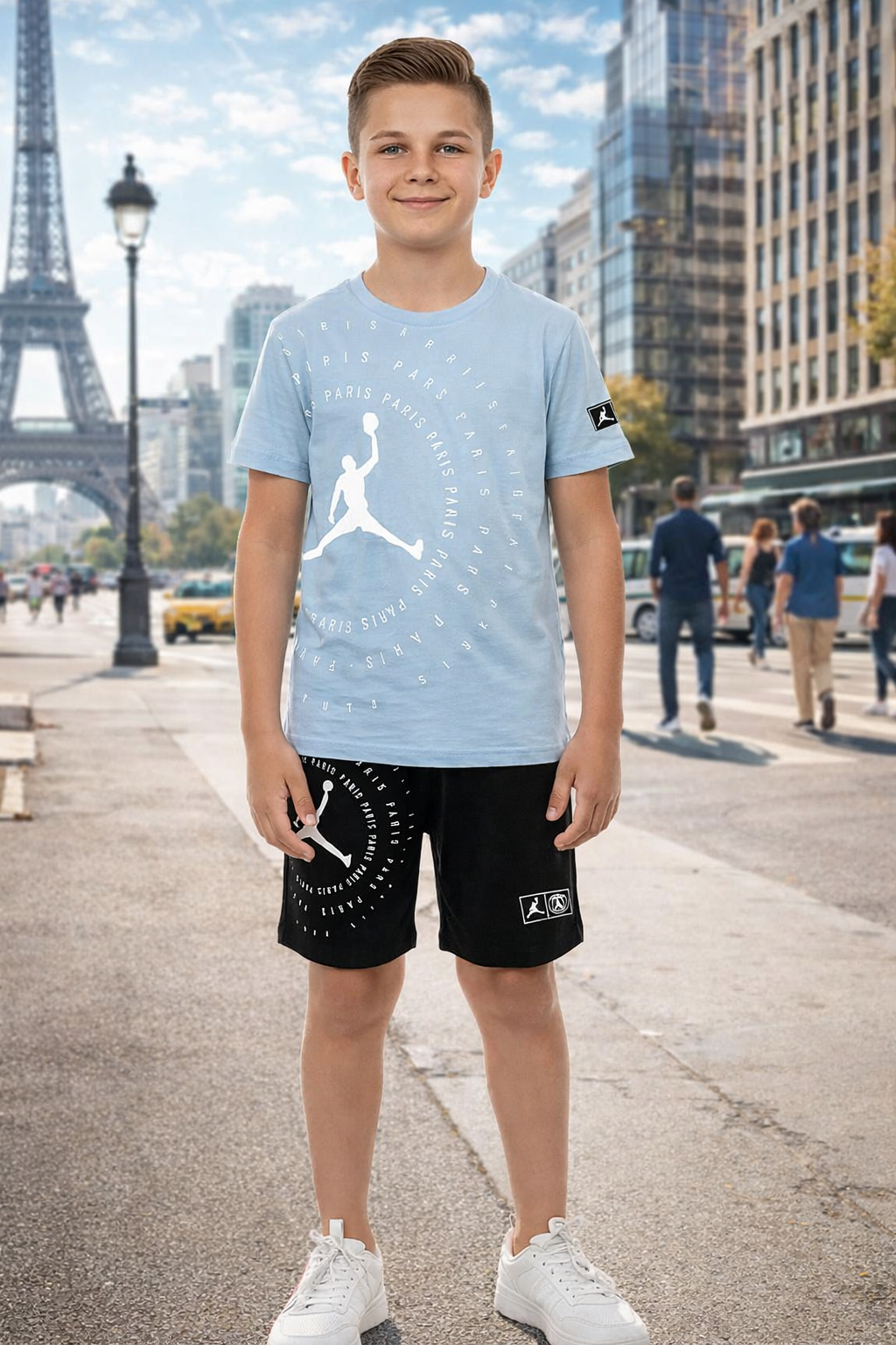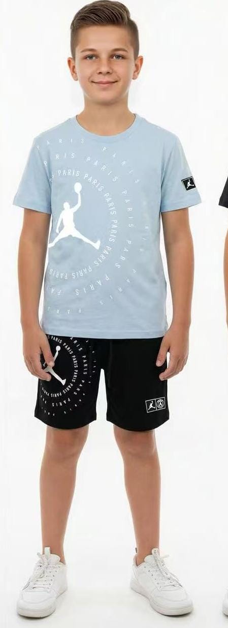 Este outfit infantil de camiseta y pantalón corto destaca por su diseño actual inspirado en la moda deportiva urbana. La camiseta en color azul claro aporta frescura y un toque moderno, mientras que el pantalón corto negro crea un contraste elegante y muy fácil de combinar con cualquier tipo de calzado infantil.