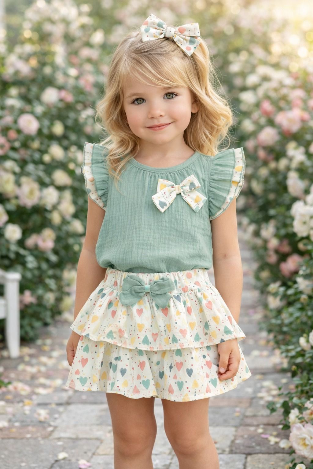 Los outfits coordinados son tendencia en moda infantil. Ofrecen un look completo sin esfuerzo y garantizan armonía en el estilo. El estampado de corazones aporta ese aire romántico y dulce que tanto gusta, convirtiendo esta prenda en un imprescindible del armario infantil.