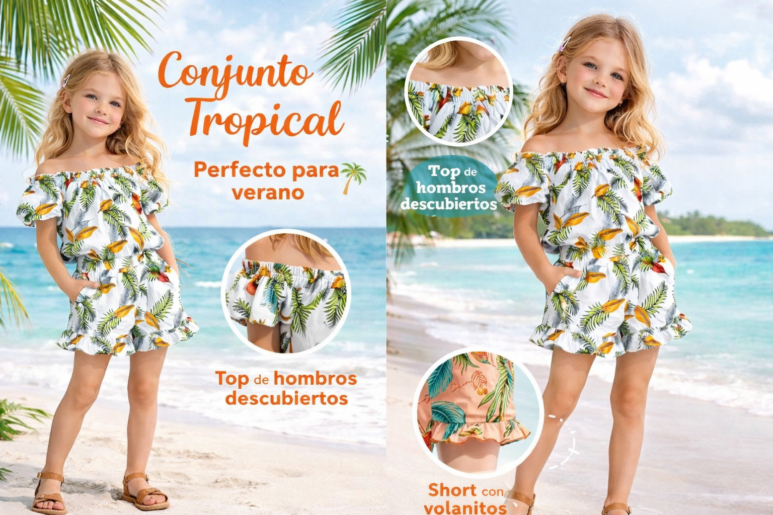 Descubre la prenda imprescindible para este verano que combina estilo, frescura y comodidad en una sola propuesta irresistible con el conjunto niña tropical. Diseñada para niñas con personalidad alegre y espíritu libre, esta opción destaca por su estampado tropical lleno de vida, evocando playas paradisíacas, días soleados y momentos inolvidables. Su diseño actual, con hombros descubiertos y un corte fluido, aporta un aire moderno y desenfadado que conquista a primera vista.